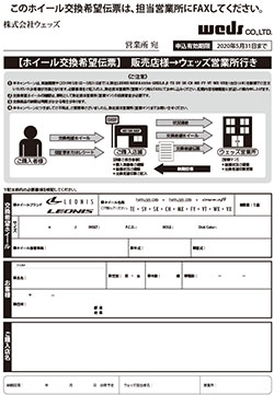 | ●用意頂く物 | : | 破損した対象ホイール・保証書または購入時の日付が入ったレシートの2点をご購入店舗にご持参下さい。 ※いずれかが不足している場合は交換できません。 |