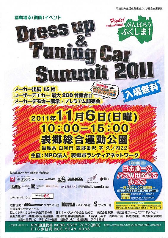 2011年11月6日(日)に福島県白河市にて、この度の震災・原発事故により被害を受けている福島県の応援活動として「Dress up&Tuning Car Summit 2011」が開催さます。(株)ウェッズもこのイベントの趣旨に賛同し出展いたします。一人でも多くの方のご参加をお待ち申し上げます!