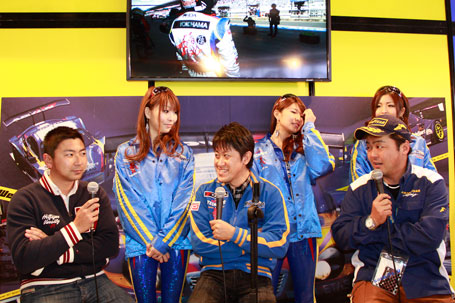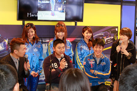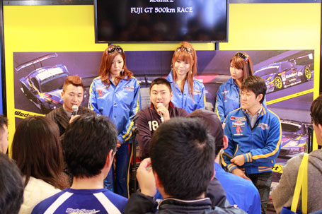 その他にも、坂東監督、荒聖治選手、片岡龍也選手、レースクィーンの吉浦遥さん、葉月みなみさん、愛原涼さんに加え、飛び入り参加でD1ドライバーの高橋 邦明選手や2011年WedsSport Racing Galsの三島ゆかりさんが応援に駈け付け、特設ステージでのトーク&撮影会ではレースの裏側やプライベートの話など多くのファンを楽しませてくれました。