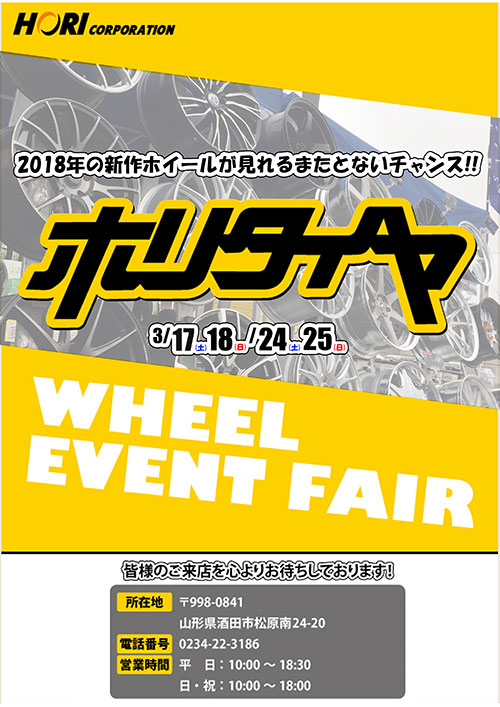 この度、3月17日・18日に「ホリタイヤ酒田店」にて『weds 2018新製品アルミホイール大商談会』を開催いたします。