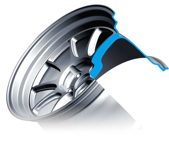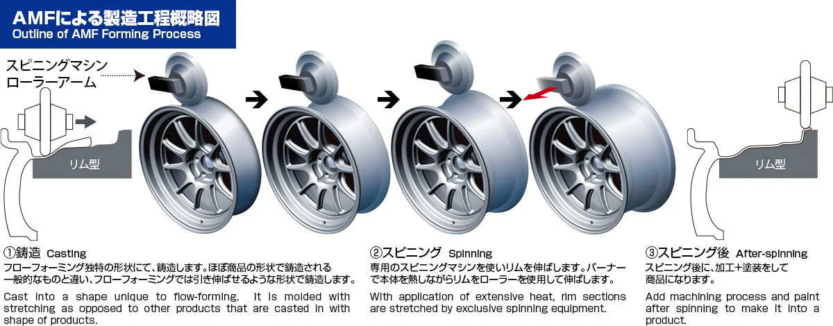 AMFのディスク面は従来の鋳造成型なので、デザインの自由度は保ちながら、リム部はスピニングマシンによって必要最低限の薄さで引き伸ばされているため、非常に軽量化され、バネ下荷重の低減に貢献するのです。 このような鋳造・鍛造両者のメリットを併せ持つ第三の製法が“AMF”(アドバンスド・メタル・フォーミング)いわゆるスピニング製法です。 ウェッズスポーツのブランドコンセプト「より速く、しかも安全に」を実現すべく誕生したAMF。モータースポーツで鍛えられた新世代テクノロジーが、驚異のパフォーマンスで登場します。